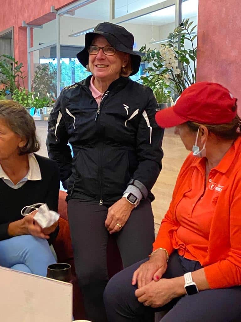 Am Mittwoch gegen 10.15 Uhr auf dem Weg zum Bus ging es dann wieder los mit dem Niederschlag. Nicht so heftig wie am Tag zuvor, aber ausreichend, um wieder pitschnass zu werden. Sieben Damen entschieden sich deshalb kurzfristig dazu, auf den Start zu verzichten – um dann – bis auf Annegret Götz – genauso kurzfristig ihre Meinung wieder zu ändern. Zum Glück. Grund 1: Kurz nachdem der letzte Flight abgeschlagen hatte, riss der Himmel auf und die Sonne schien wärmend auf uns herab. Unfassbar. Unglaublich. Unvorstellbar. Grund 2: Unsere „Hof-Fotografin“ Annegret konnte mit gezückter Kamera tolle Fotos von uns und dem Platz machen und wird daraus wieder einen Bildband erstellen, der käuflich erworben werden kann. Etwas Pech hatte dagegen die Schreiberin dieses Berichts mit dem Entschluss, nicht wieder wie eine nasse Katze aussehen zu wollen und sich daher rasch noch einen Regenanzug zulegte. Den hätte es an diesem Tag so gar nicht gebraucht.