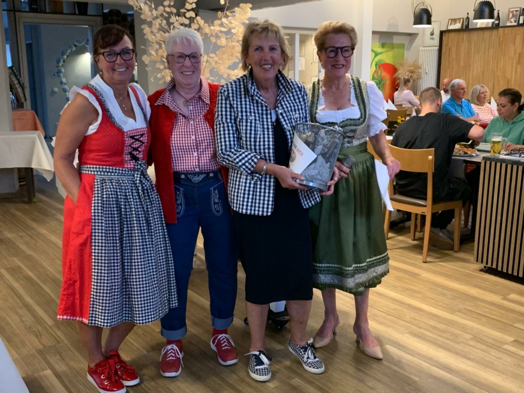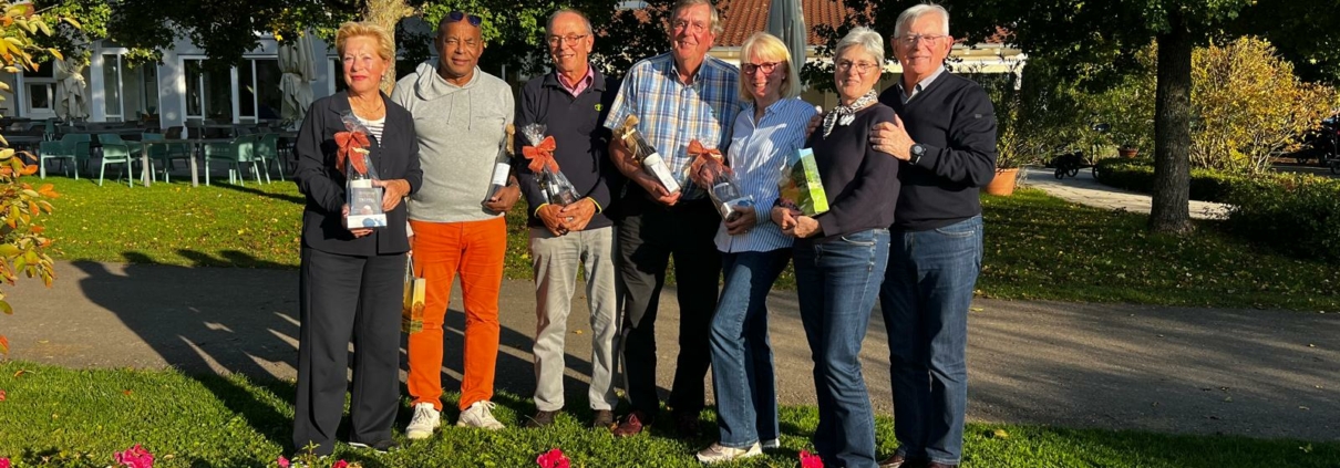 Eine sonnenbeschienene Terrasse, die milde Herbstsonne beleuchtet die Szenerie, ein weißer Hut erregt einige Aufmerksamkeit, nach und nach vergrößert sich die Gesellschaft, Geplauder über dies und das. Ganz bestimmt keine Golfer! Es fehlt die passende Thematik: der verlorene Ball, der ausgelippte Put, … . Und doch ist es so. Nach und nach finden sich die Teilnehmer des 3-Schläger-Turniers ein. Nur drei Schläger!? Na klar, rein rechnerisch ergibt sich daraus weit weniger Stoff als wenn man von 14 erzählen kann. Letztlich war es eine entspannte Runde bei schönem Herbstwetter. Ebenso lässt sich die Runde im Clubrestaurant an, eingedeckt für einen kleinen Imbiss. Jeder bestellt nach Belieben, je nachdem wie viele Würstchen er sich im Halfwayhaus gegönnt hat, und dann beginnt auch schon die Preisverleihung. Die Ergebnisse sind breit gestreut. Und für einzelne müsste die Empfehlung lauten zukünftig mit drei Schlägern zu spielen! Sponsor war heute die Kasse des ASK und damit auch ein Dank an Sabine für die ansprechende Gestaltung der Preise.